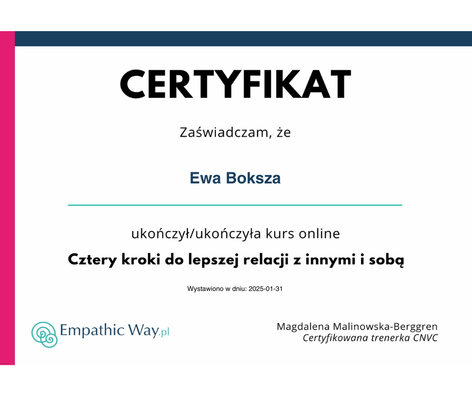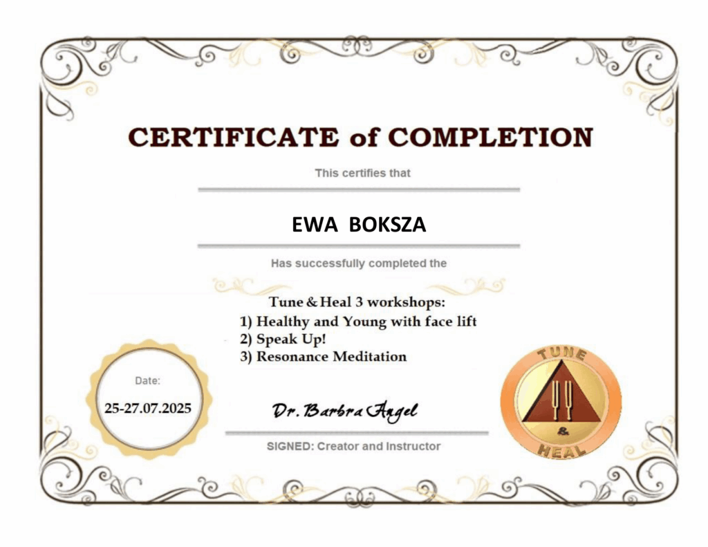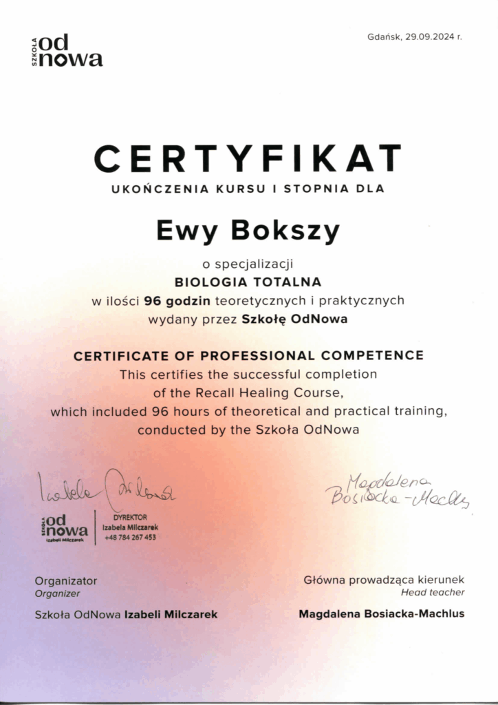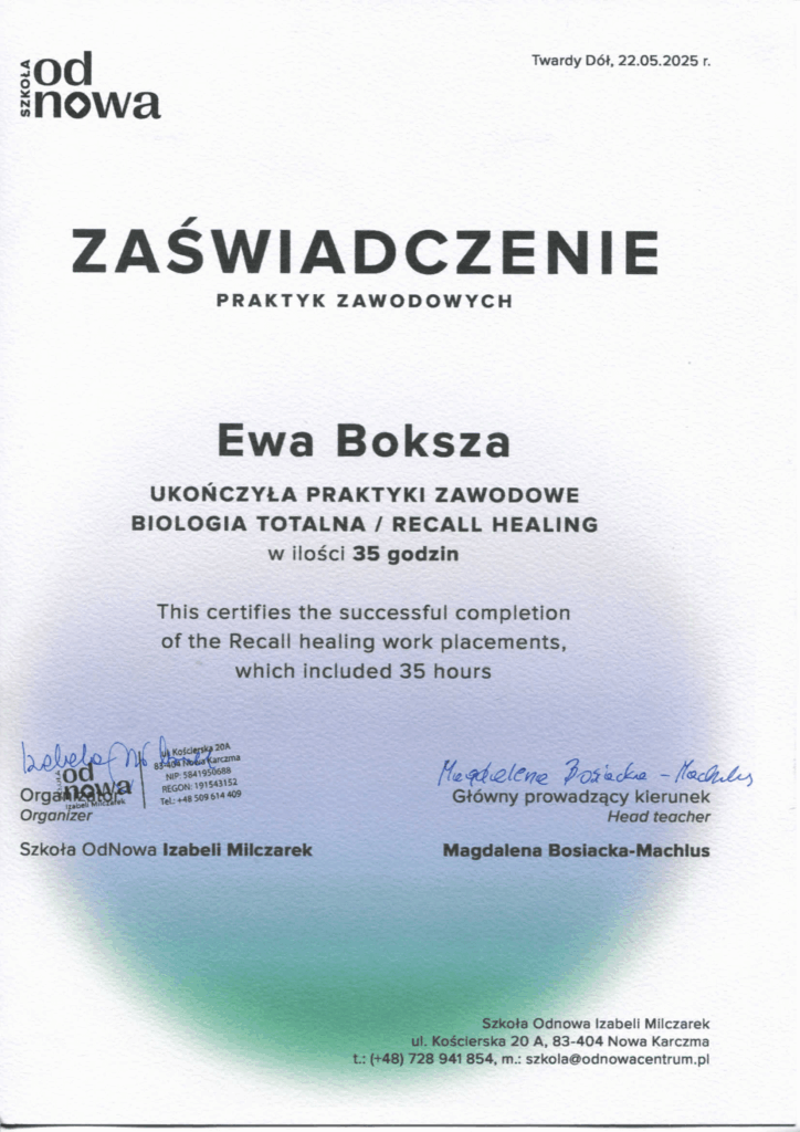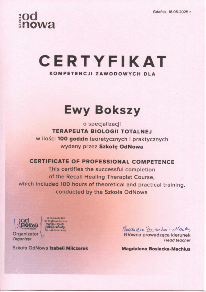 Ukończyłam pełny cykl szkoleń w Szkole Odnova, gdzie zdobyłam certyfikację kompetencji zawodowych o specjalizacji terapeuty Totalnej Biologii oraz odbyłam praktyki. Wiedzę z zakresu terapii dźwiękiem zdobywałam m.in. podczas warsztatów Tune & Heal. Mam także doświadczenie w obszarach Porozumienia bez Przemocy, mediacji, pracy z ciałem i koherencją umysłu oraz ponaddwudziestoletnie doświadczenie zawodowe w pracy z ludźmi – od korporacji po mniejsze organizacje.